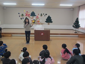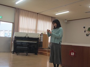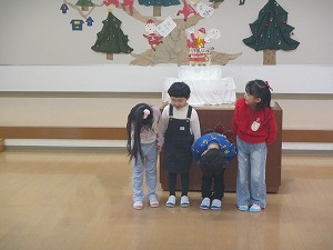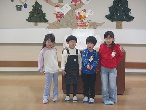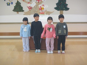 年長組年中組が2学期にがんばったことや楽しかったことをみんなの前で話しました。一人一人が自分の言葉で話していました。(これも立派な成長の姿です。)