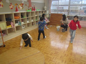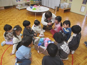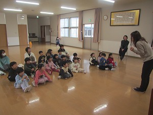 終業式でお話を聞いていた年少組も「楽しかったこと」を話したくなったようです。保育室でみんなで円になって話をしました。年少組も、友達の話に気持ちを向けて、上手に聞けるようになってきました。