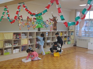 それからどの学年も保育室の大掃除をしていました。道具箱、製作に使ったテーブルやままごとも、雑巾を固く絞ってきれいに拭きました。自分たちの使った場所をきれいにしたら、清々しい気持ちになりました。