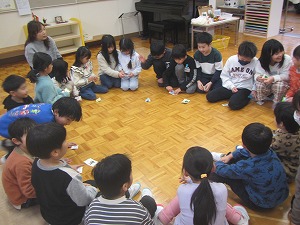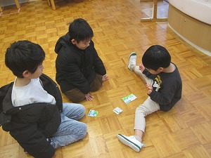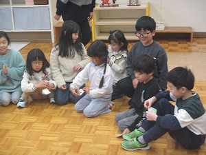 昼休みに新津第一小学校の2年1組の皆さんが遊びに来てくれました。幼稚園の子どもたちと一緒に遊べるように…と一人一人が手作りおもちゃを持っています。園児と小年生で2~3人のペアを作り、はじめに小学生が遊び方を見せてくれました。牛乳パックでできたぱっちんガエルは、子どもたちがそぉっと手を離すと「ぴょーん」と跳ね上がります。「わあっ、もう一回!」と目を輝かせる園児。園児がやりやすいように手を添えてやり方を教えてくれるやさしい2年生のお兄さんとお姉さんでした。