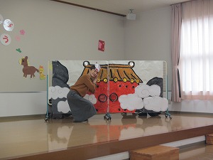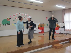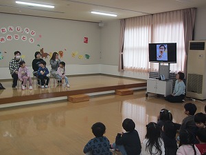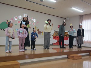 先生たちのお楽しみは、「十二支のはじまり」の劇遊びです。誕生児の子どもたちも、猫や虎、うさぎ、羊になってアドリブで名演技を見せてくれました。