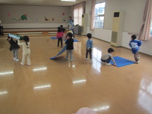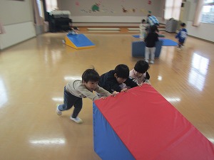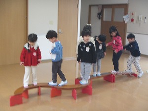 お家の人が担任の先生と学級懇談会をしている間、遊戯室で遊びました。一本橋やマット、縄跳び…少し難しいことにも繰り返し挑戦し、「みててみてて!」と遠くまで跳ぶ姿や走るようにはしご渡りをする姿を、目を輝かせて職員に見せてくれました。