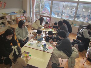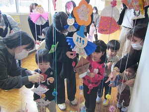 「重たいものもみんなで運べるよ!」片付けもとっても上手にできました。吊るし雛飾り作りもしました。表情豊かなおだいり様とおひな様、うまができました。