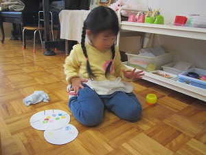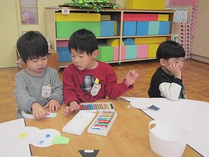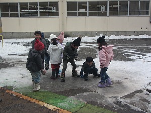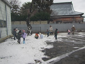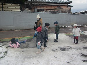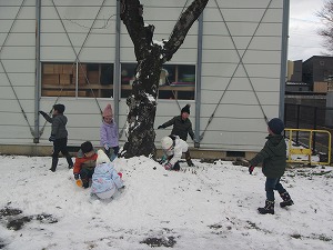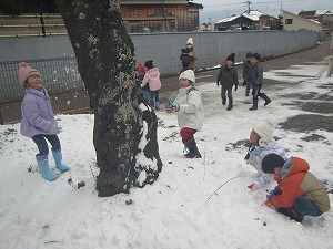 外で遊んでいた年長児と年中児は、幼稚園にスケートリンクができていることを発見しました。ツルツルで楽しい~。今日は、昨日と違ってにぎると雪玉が作りやすい雪が積もっています。子どもたちは「えーい」と雪玉を遠くに投げたり、木の幹と幹の間を狙って投げたりして遊んでいました。
