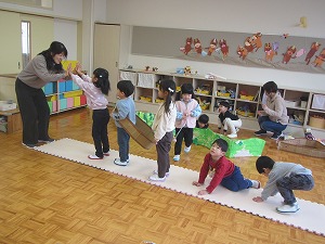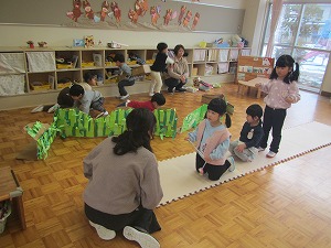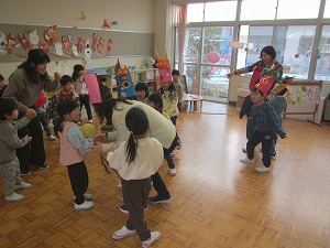給食後、年少組の保育室からにぎやかな声! 誰か?が来たようです。びっくりして先生の後ろに隠れる姿、じーっとお部屋にやってきた誰か?を見つめる姿もありました。