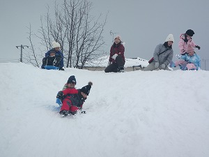 年長組と年中組は一小山でそり遊びをしました。2人組になってそりに乗り「それっ」と風をきって坂道を滑り降ります。途中で雪の中に突っ込んだりコースアウトしたり…そんなことも楽しくて、笑いながら「もう一回しよう!」と山を何度も駆け上がっていくたくましい子どもたちでした。