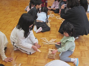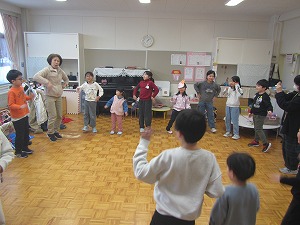 給食後は、2年生と一緒に遊びました。年少児は、小学生と踊ったりカプラをしたりしました。2年生が優しく接してくれるので、お兄さんお姉さんと一緒に遊ぶことが大好きになりました。