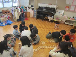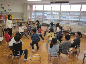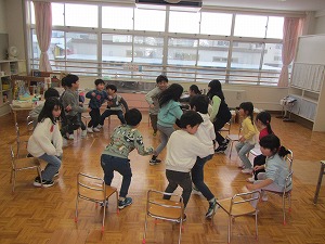 年長組と年中組は、保育室でフルーツバスケット。ルールを覚えて、お兄さんとお姉さんと一緒に素早く席を探していました。