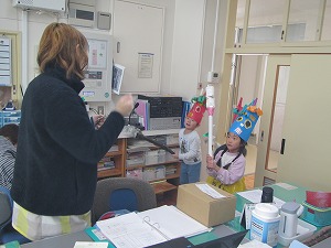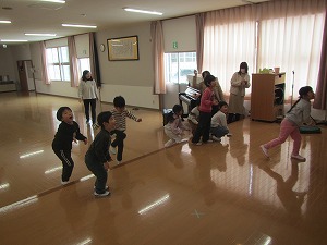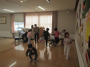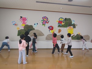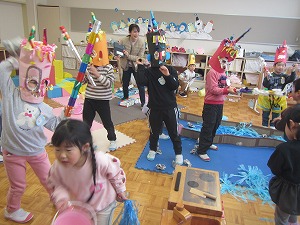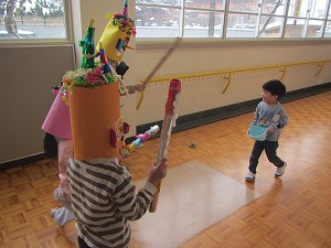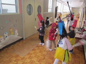 遊戯室では、年長・年中児が「おねぼうする鬼はーそと」「おこりんぼうの鬼はーそと」と自分のおなかの中にいる鬼を思い出して、豆まきをしていました。