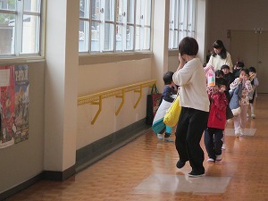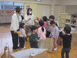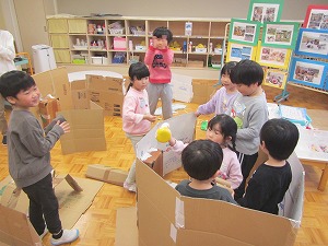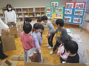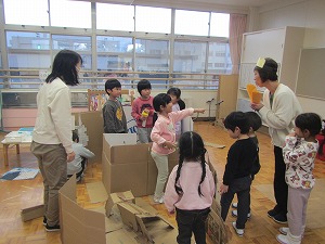 登園後、朝からの遊びでは、年少組が2階の年長・年中組の保育室に出掛ける姿がありました。