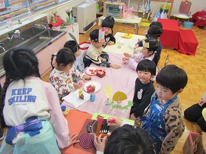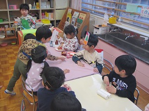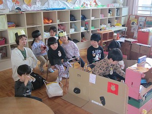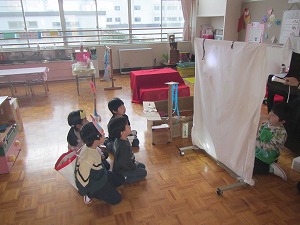 年中さんの保育室では乗り物に乗り、最初に映画館に到着しました。ゆらゆら揺れる影絵の映画を楽しんでいたら、なんだかおなかが空いて喉が渇いてきました。