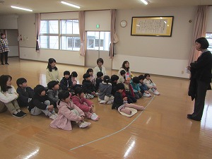 今年度最後の避難訓練をしました。園児には予告をせずに行う訓練です。非常ベルの大きな音に驚いた子どもたちでしたが、放送や先生の指示を聞いて、遊戯室に避難しました。