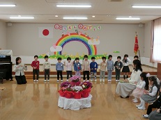 年少いちご組に4人のお友達が入園しました。入園式で、年長組と年中組の子どもたちは、お気に入りの歌をプレゼントしました。そして、みんなで一緒に大きな声で「いっしょにあそぼうね!」