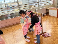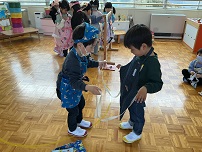 そんな時は、もみじ組さんが手伝ってくれます。向かい合わせになると、いつもの縛り方と逆になります。もみじ組さんも左右の紐を確かめながらリボン結びをしてくれました。さすが一番大きい組のお兄さん、お姉さん。頼りになります!