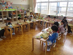 心地よい春の日差しの下で遊んだ後は、おなかがペコペコです。今日から、給食が始まりました。すみれ組さんも真新しいエプロンと三角巾、マスクをつけて給食のお当番をやります。でも、エプロンの紐の結び方が難しいね。