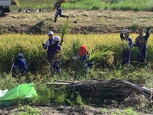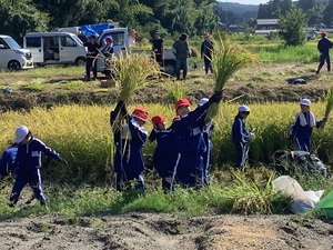 前日までの雨に右往左往しましたが、春から取り組んできた米作りがフィナーレへ!!少し汗ばむ中でしたが、自分たちが植えた小さな小さな苗が、自分たちと同じように大きく成長し、素敵な実をつける…。これまでの成果が5年生のみんなの笑顔に表れていますね!!