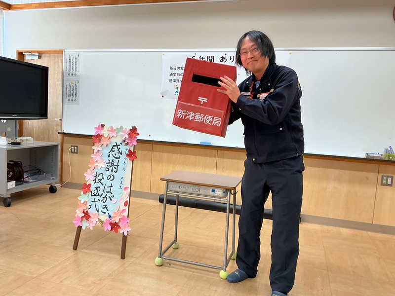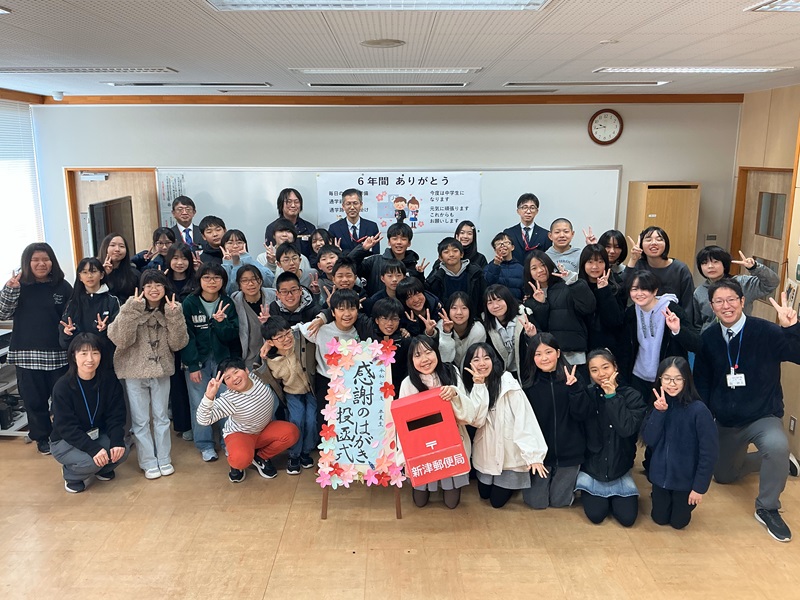新津郵便局の皆さんをお迎えし、毎年恒例の【投函式】が行われました。明後日の卒業式の日、それぞれの送り先に届きます・・・。これまでの感謝を、1枚のハガキに託して・・・。