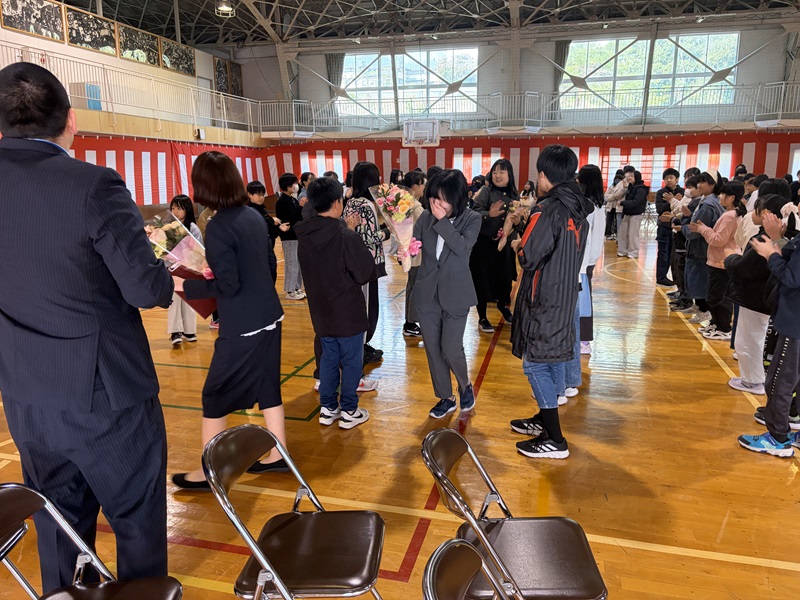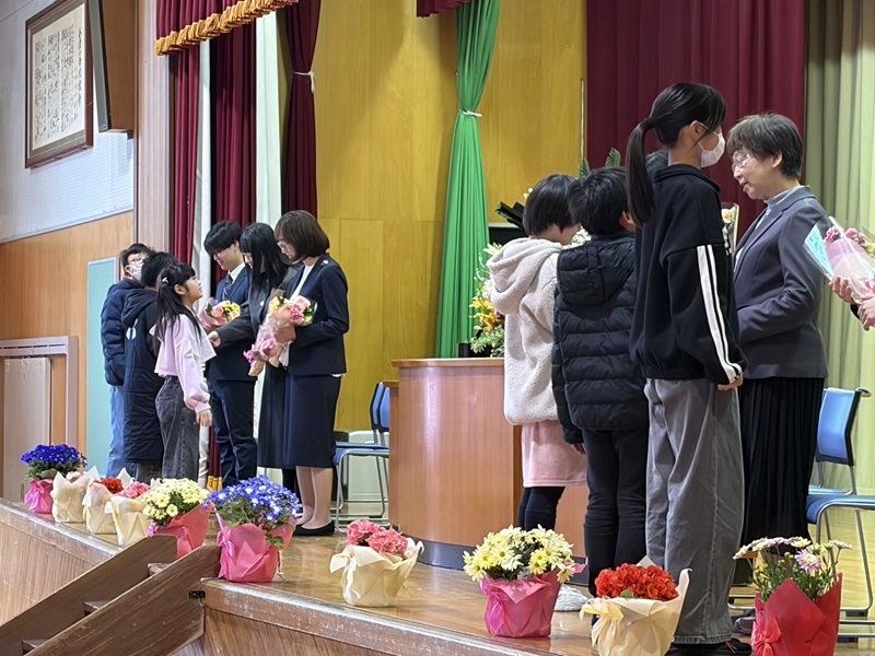 卒業生を見送って5日。大好きな先生方とのお別れの日。子どもたちは何やら神妙な面持ちで登校してきました。離任する職員の入場に、何とも言えない表情をする子、泣き出す子、様々でした。そのくらい子どもたちと職員との『絆』は深かったのだと感じさせる瞬間でした。