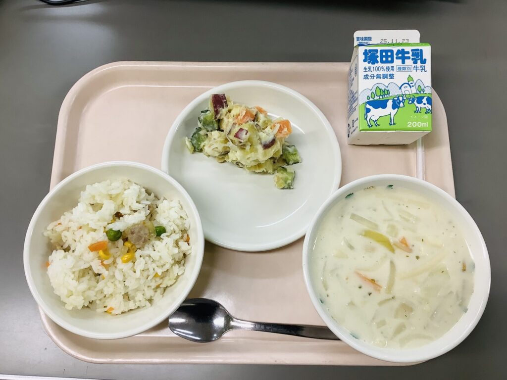 今日は「小さなスプーンおばさん」とのコラボ給食でした。献立の内容は、3色ピラフ、マカロニのクリームスープ、アーモンド入りダブルポテトサラダ、牛乳です。とても美味しかったです!
