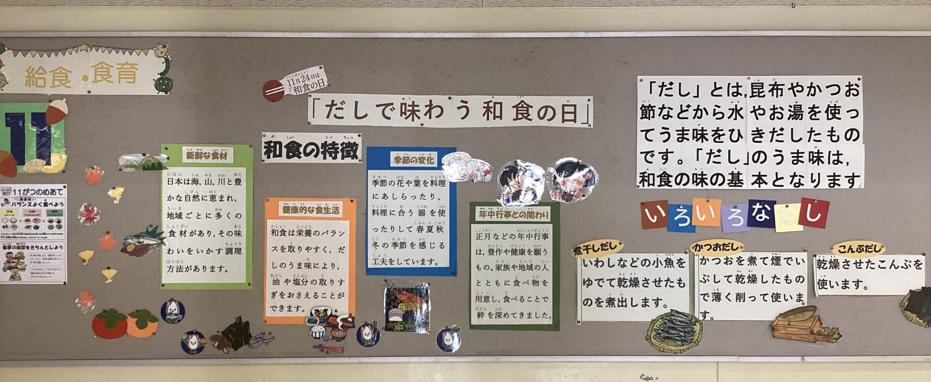 給食、保健の掲示版が新しくなりました。 給食の掲示板は「だしで味わう和食の日」、保健の掲示板は「いい歯の日」について掲示してあります。日にちは、「いいにほんしょく(11月24日)」、「いいはのひ(11月 …