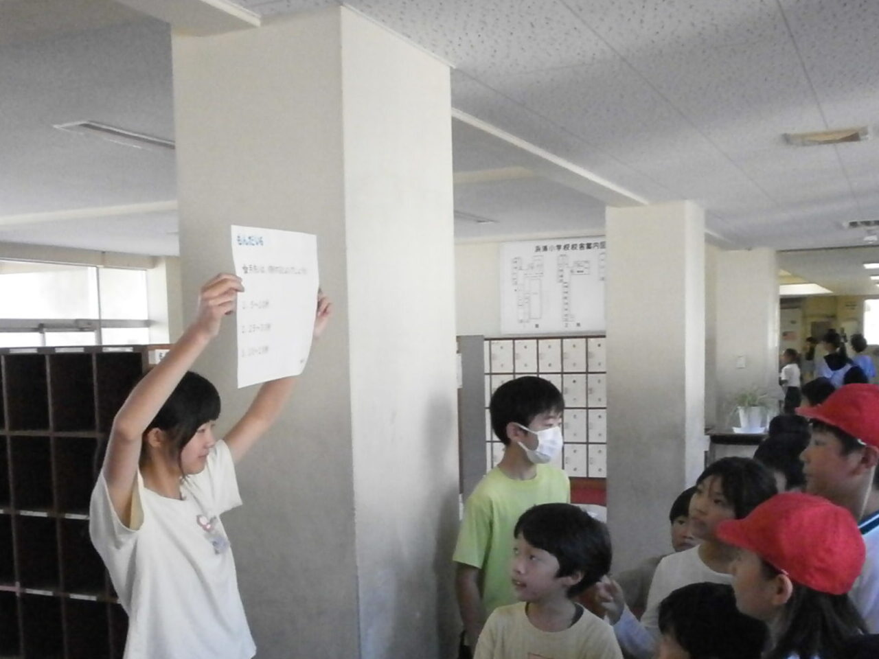 健康委員会の5・6年生が私たちの健康や体についてのクイズを持って、校内のどこかに立っています。そのクイズを浜っ子グループ全員で見つけて、問題に答えていきます。班全員で楽しみながら、健康について学ぶことができました。
