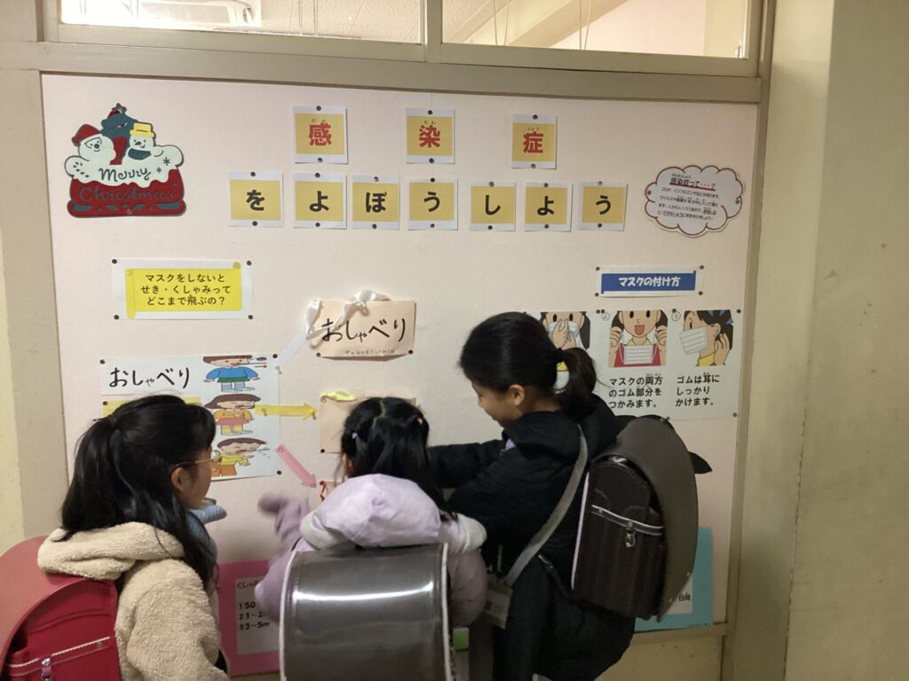 給食掲示板は「寒さに負けない体をつくろう!」、保健掲示板は「感染症をよぼうしよう」です。おしゃべり、咳、くしゃみがどのくらい飛ぶのか、掲示しました。子どもたちは、おしゃべりでも、1m飛ぶことが分かり、驚いていました。新潟県ではインフルエンザ警報が発令されています。元気で過ごせるように、栄養、休養、運動で抵抗力を高めてほしいと思います。