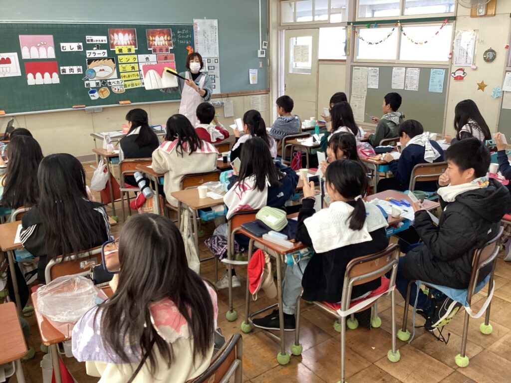 歯科衛生士の方に来ていただき、歯みがきの方法やデンタルフロスの使い方について学びました。初めて、歯垢の染め出しをした児童が多く、赤くなり驚いていました。赤く染まった歯垢は、歯ブラシで丁寧にみがけていました。春の歯科健診で5年生は、むし歯ゼロでした。これからも、歯を大切にしてほしいと思います。