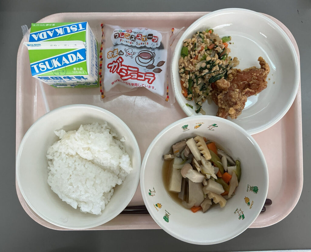 今日は、のっぺ汁、鶏肉の半身揚げ、きりざいと新潟の郷土料理でした。そして、浜っ子フェスティバルのデザート選べる券で、当選者の児童が選んだ「ガトーショコラ」が付きました。子どもたちは、大興奮していました。