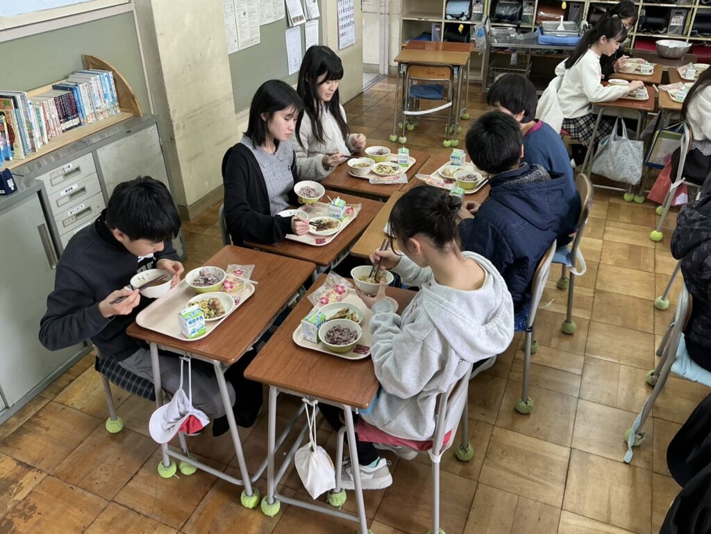 6年生は、小学校生活最後の給食でした。今日の献立は、赤飯や沢煮椀、お祝いクレープなど特別メニューでした。楽しく、おいしく給食をいただきました。