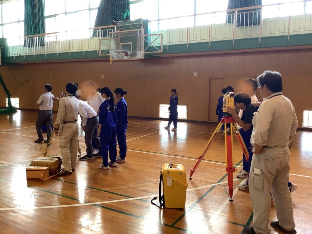 10月3日(金)、土木や建設業にかかわる団体の方々(約20名)から来校いただき、地域を支え暮らしを守る建設業の重要性と魅力を教えていただきました。 測量・ドローン・ハンドレーザー(対象物までの …