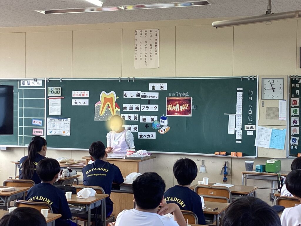 10月7日(火)、1年生がむし歯や歯肉炎の予防について学びました。歯垢の存在をわかりやすくするために染め出しを行いましたが、歯が真っ赤に!歯垢を効果的に除去するためのブラッシングやフロスの使い方が …