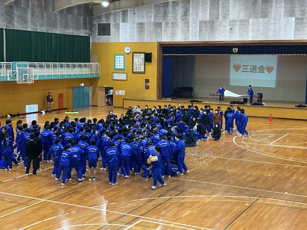 2月13日(金)三送会を行いました。クイズ・リズムダンス・総踊り・3年間の振り返りムービー・お世話になった先生方からのメッセージ&ビデオレター・3年生の漫才…。盛りだくさんの内容で、会場が温かい雰 …