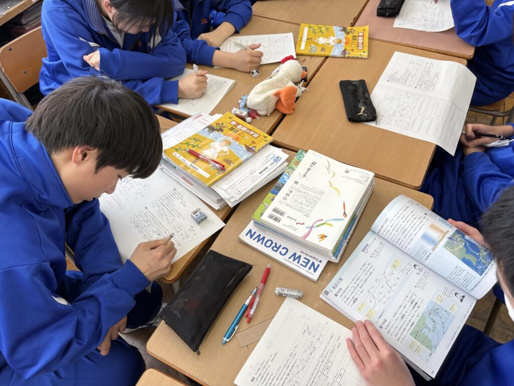 2月3日(火)定期テストに向け、仲間に教えたり教わったりして課題を解決し、学力向上を図る活動を行いました。「仲間に説明したり、教えたりできるということは、しっかりと身についている証拠!」定期テスト …