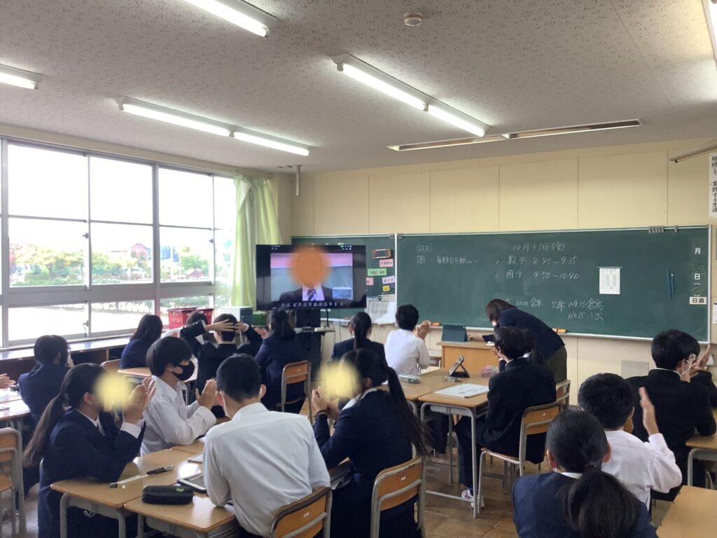 避難後は、北区地域総務課の方から「 自宅で水害が起こった時の避難 」というテーマで、クイズを交えながら話をしていただきました。生徒は班ごとに考えをまとめ、代表者がオンラインで発表してくれました。いざというときに、適切な行動がとれるといいですね。