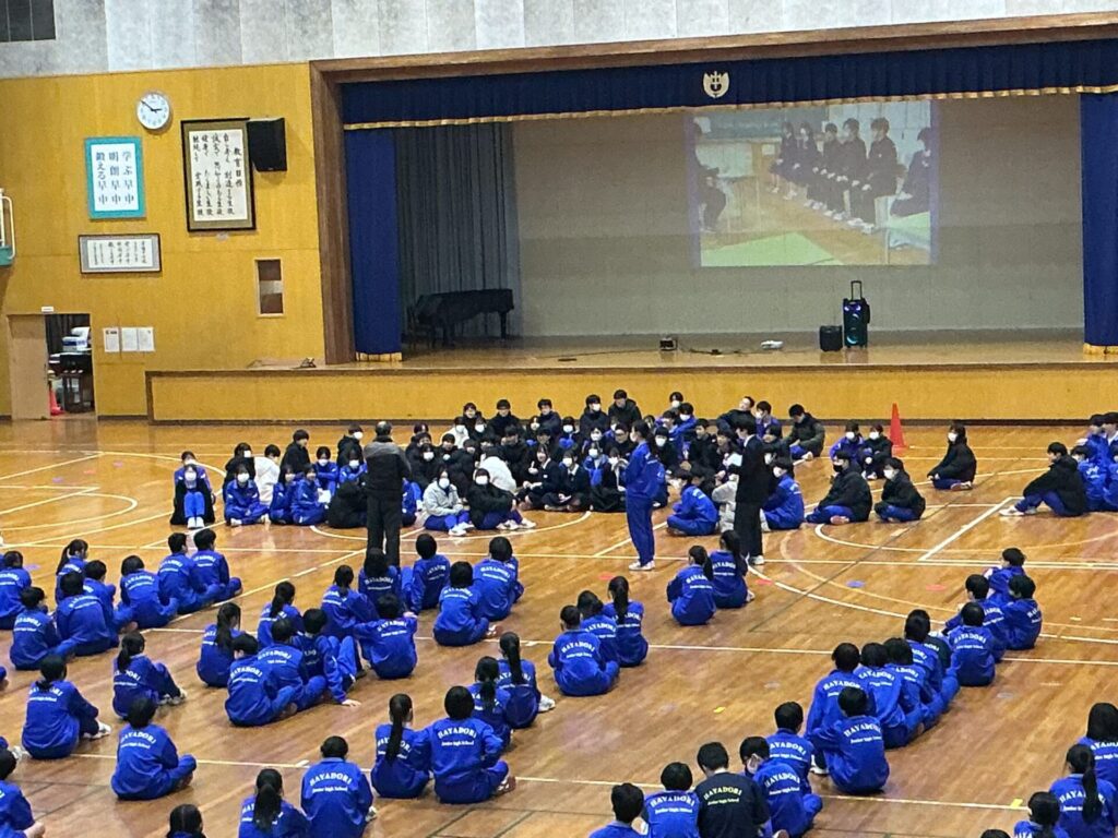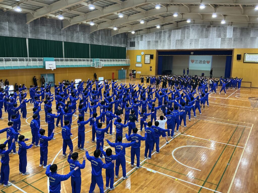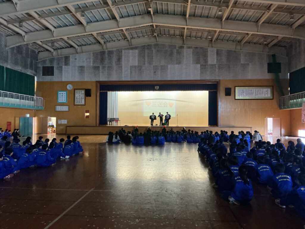 2月13日(金)三送会を行いました。クイズ・リズムダンス・総踊り・3年間の振り返りムービー・お世話になった先生方からのメッセージ&ビデオレター・3年生の漫才…。盛りだくさんの内容で、会場が温かい雰囲気に包まれました。