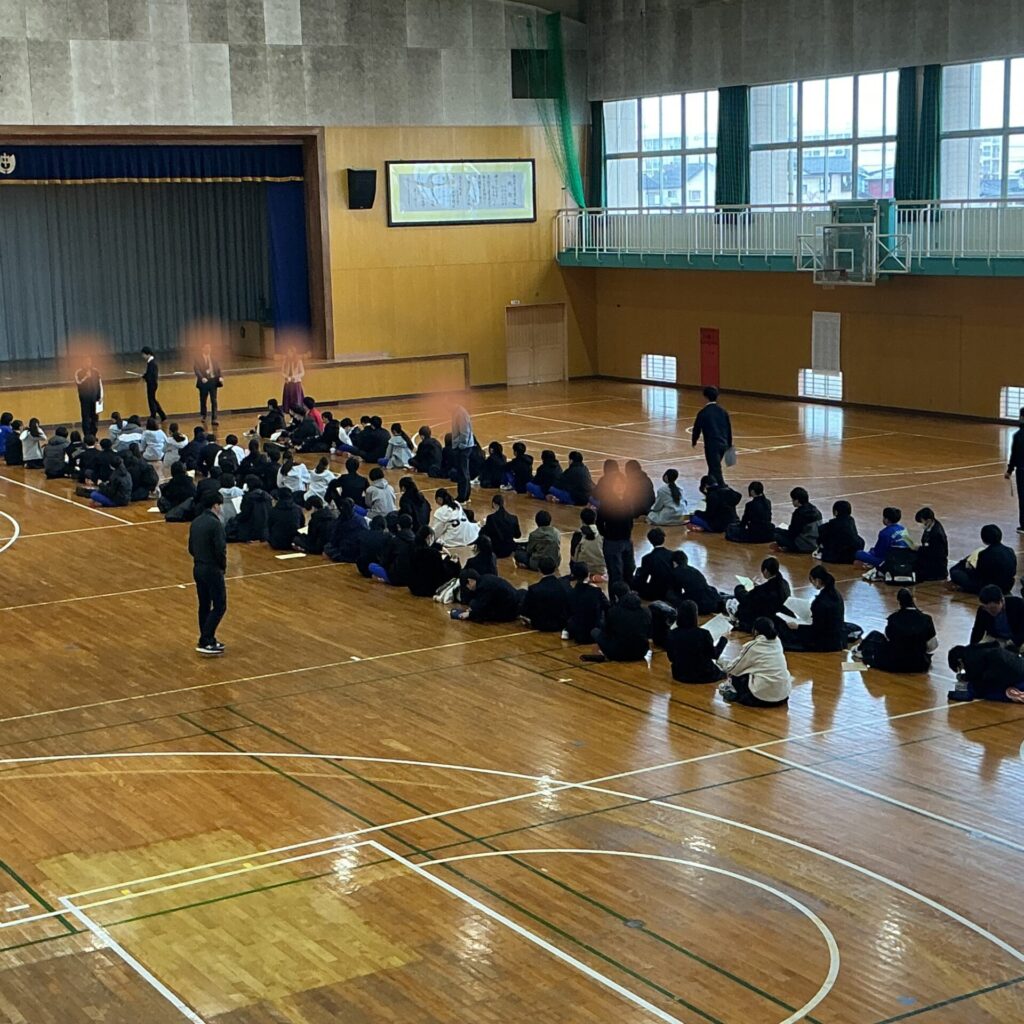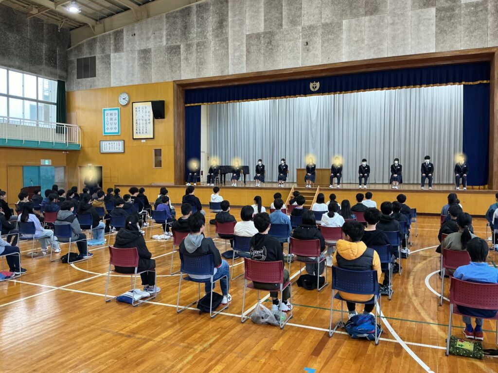 新入生は、生徒会役員のみんなと一緒に入学式の動きを確認できました。次は、4月8日(水)着任式・始業式・入学式です。みんなの登校を待ってます!