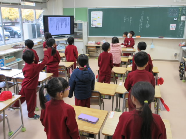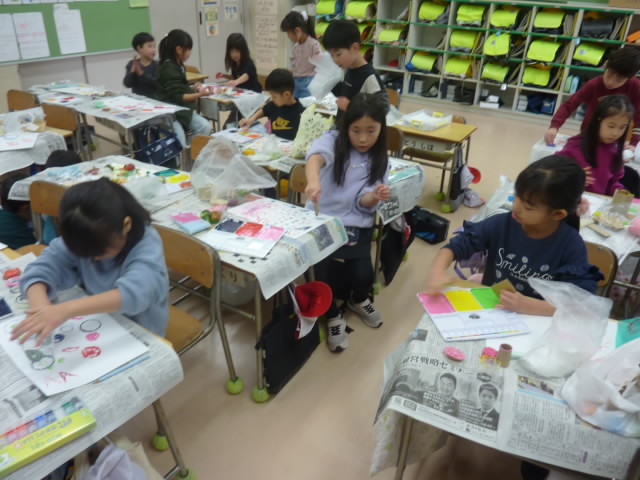 1年生は図工で,レンコン,ピーマンなどの断面が面白い形の野菜やプリンカップ,緩衝材,梱包材などのスタンプになりそうな物に絵の具をつけ,紙に写し取って絵に表しました。 出来上がった形からいろいろなも …