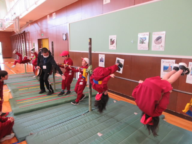 2年生は「くるりんベルト」を使って逆上がりに挑戦していました。 お腹と鉄棒が離れないようになるため,あとは「タタン,ギュッ」のリズムで足を蹴り上げて体幹を締める動きで回転までのコツをつかみます。 …