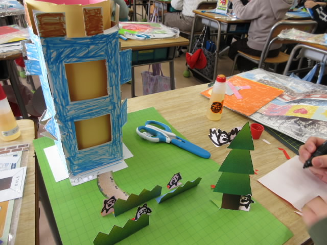 2年生は図工でカッターを使った工作に取り組んでいます。 建物や周りの様子をイメージして,窓の奥にいる人や動物を裏から丁寧に貼り付けています。 一人一人違った世界観が伝わってきて「いいね!」