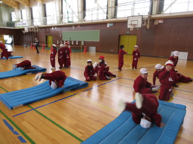 体育でマットを使った運動遊びをしている1年生。 今日は初めて「後ろ回り」に挑戦です。 回転感覚や逆さ感覚が必要になるため,最初の頃は着手する手が逆になったり,怖かったりする子もいます。 坂道マ …