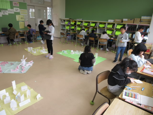 1年生は図工「おって たてたら」で作った作品を友達と一緒に並べてみたら,町や野原,海などができあがりました。 黙々と作り足したり,できたものを眺めて写真に撮ったり。 とっぷりと制作の世界に浸って …