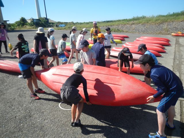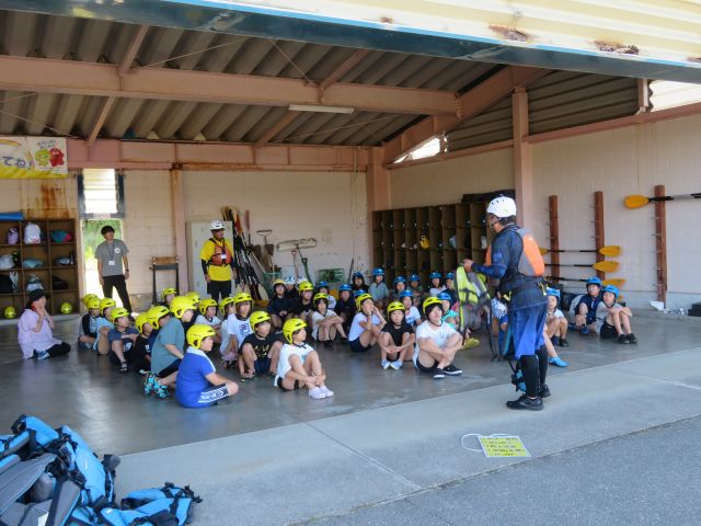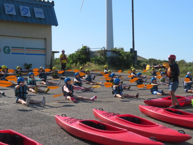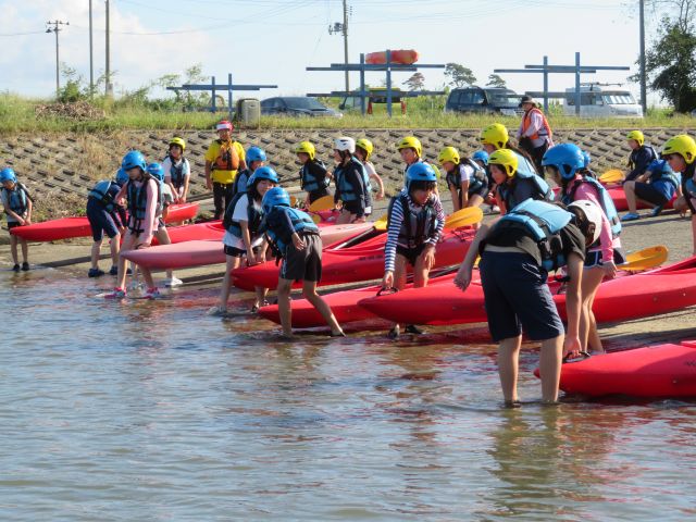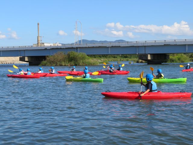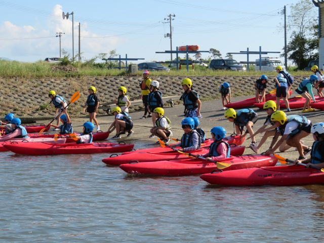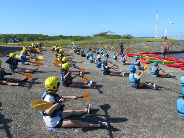 指導員の先生のお話を聞いた後,ヘルメットとライフジャケットを身に付け,広い河口に漕ぎ出しました。