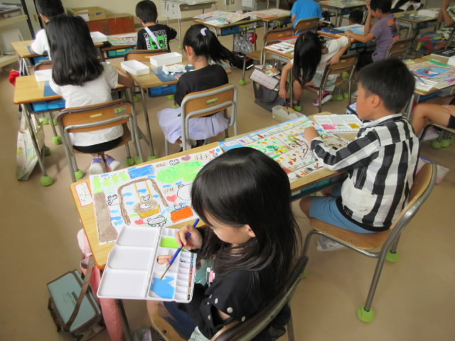 4年生と1年生は,今月下旬に開かれる絵画展に向けて作品づくりに励んでいました。