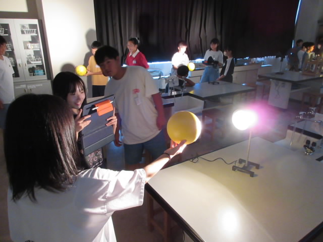 上弦の月(半月)を作り出すため,暗くした理科室で,ライトを当てて光るボールの明るい部分と影の部分の形を観察しました。
