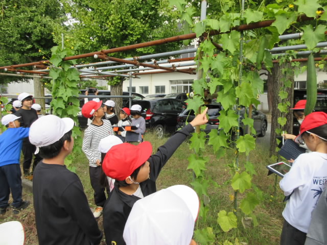 理科の学習で秋探しに前庭にやってきた4年生は,ヘチマの育ち具合に驚いていました。