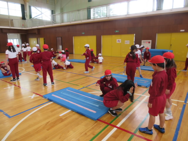 もう片方のクラスは,マット運動の後転に挑戦です。