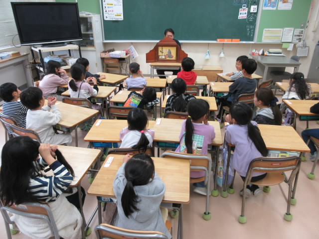 1年生のこのクラスでは,研修のため出張で不在の担任に代わって,校長による特別授業・紙芝居の読み聞かせが行われていました。
