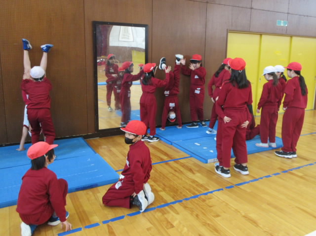 苦手な子は,壁のぼり逆立ちをしたり,友達に補助してもらったりしていました。