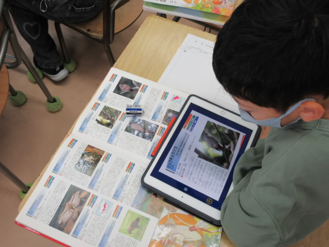 国語『ビーバーの大工事』の学習をした2年生は,いろいろな動物の秘密を調べて「どうぶつカード」を作っていました。