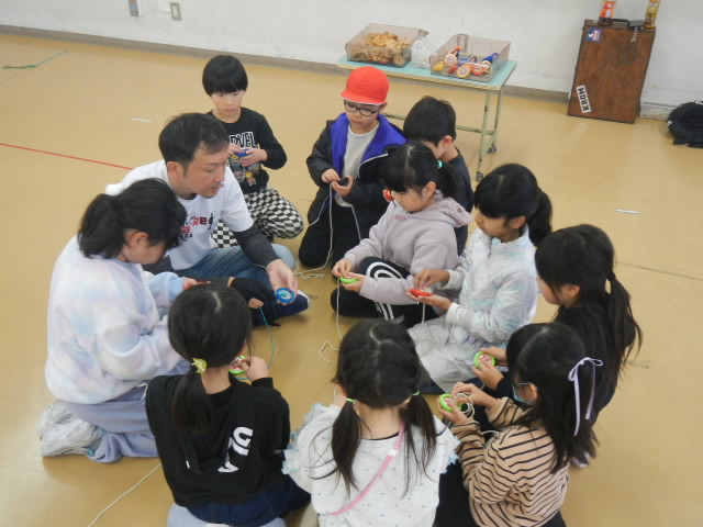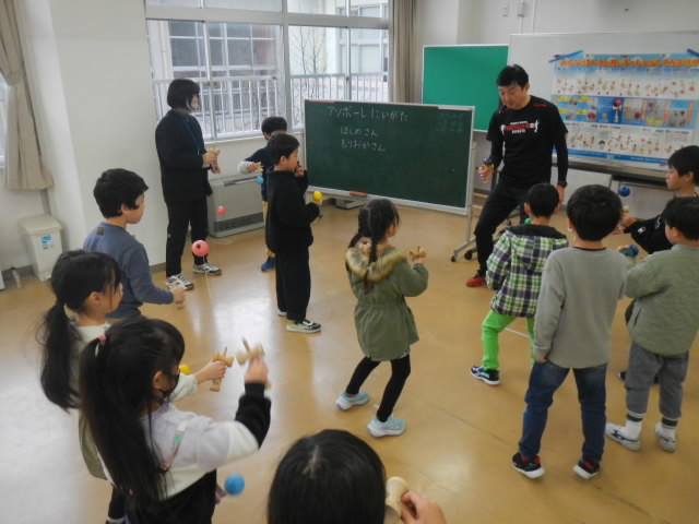 生活科の学習で1年生は,ゲストティーチャーから昔遊びのけん玉とこま回しを教わりました。